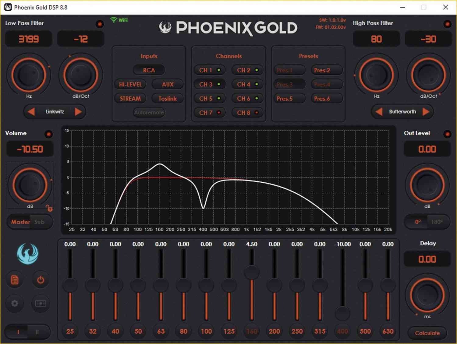 | Hoch- und Tiefpass | 1/12-Oktav-Schritte Bessel, Butterworth, Linkwitz, bis 30 dB/Okt |