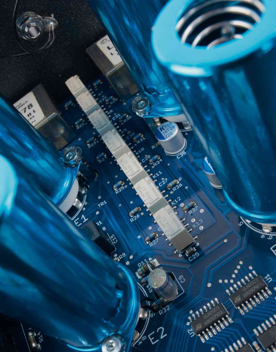 Auf der Rückseite gibt‘s ein Paar äußerst solide mit dem sehr stabilen Gehäuse verschraubter Cinch-Ausgangsbuchsen und zwei Paare für die Eingangssignale. Die dürfen gleichzeitig belegt werden, so dass man zwei Tonabnehmer an dem Gerät betreiben kann. Nicht zwangsläufig ein MM und ein MC, mittels eines externen Übertragers wäre auch der Anschluss eines zweiten MCs machbar. Erdungsklemme? Aber sicher doch. Und nun? Nach der initialen Freude über die 16 feinen Gehäuseschrauben könnte man ja auch endlich mal unter den Deckel gucken. Dreieinhalb Kilo schwarz pulverbeschichteter Stahl. Kein Witz. Und darunter? Ein weiteres Blech, das Spreu und Weizen, respektive Stromversorgung und Signalverarbeitung voneinander separiert. Alles eine Nummer zurückhaltender als beim Topmodell, aber immer noch äußerst gehaltvoll. Den Strom besorgt ein würfelförmig gekapselter Trafo links hinter der Front. Die Netzteilplatine macht aus dem Angelieferten gleich im Nachgang Kost, den die Verstärker- und Bedienteil verwerten können. Beim Topmodell regelte noch eine Röhre die Hochspannung für die Verstärkerröhren, das gibt‘s hier nicht. Wohl aber diverse Netzfiltermaßnahmen, die unter anderem Ungemach des kleinen Standby-Schaltnetzteils ausmerzen. Womit die Hälfte des nicht eben kompakten Gehäuses schon mal mit Leckerem besetzt wäre.
