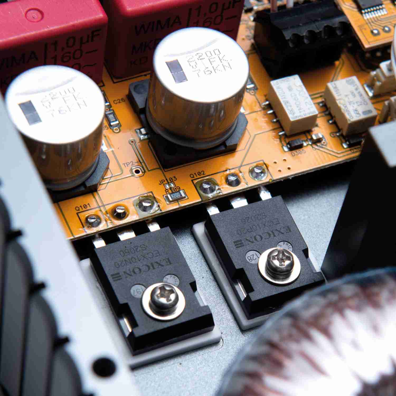 Der Aufbau des AMP-23R verfügt über zahlreiche Parallelen zu dem des Vorgängers und fußt ebenfalls auf der in Japan entwickelten „Satri“-Verstärkertopologie, zu der wenig in Erfahrung zu bringen ist. Das stromgegengekoppelte Konzept gilt als sehr breitbandig und erlaubt die Verstärkungseinstellung über einen einzigen Widerstand. Davon macht der Hersteller hier Gebrauch und ersetzt besagten Widerstand durch eine per Relais geschaltete Widerstandsanordnung, die die Funktion des Lautstärkestellers übernimmt. Der Vorteil an der Sache: Der Störabstand des Verstärkers ist vom eingestellten Pegel unabhängig und immer konstant. Die Steuersignale für den Relais-Pegelsteller erzeugt übrigens ein klassisches Motorpoti, dass andernorts das Lautstärkethema direkt erledigen würde. Die Satri- Module – die aktuelle Generation hört auf den Namen „Ensence“ – verstecken sich unter Kühlkörpern auf der Hauptplatine. Fürs Grobe ist pro Kanal ein Pärchen Lateral- Mosfets vom britischen Hersteller Exicon zuständig, die der Konstrukteur für die besten Leistungstransistoren hält, die man derzeit kaufen kann. Besonderen Aufwand trieb man bei der Arbeitspunkteinstellung der Endstufe. Sie läuft prinzipiell im AB-Betrieb, jedoch sorgt eine aufwändige Lösung mit Mikrocontroller, A/D- und D/A-Wandlern dafür, dass der Ruhestrom immer exakt auf gewünschtem Niveau gehalten wird. Aktuell heißt die Anordnung „JET2“. Die komplette Verstärkerlösung ist natürlich mit diskreten Halbleitern aufgebaut und verzichtet auf jede Form von Über-alles- Gegenkopplung, aber das ist heutzutage ja schon fast Standard. Was nicht heißt, das hier nicht eine Menge „Vielbeiner“ zum Einsatz kommen, aber eben nur in peripherer Funktion. Die Stromversorgung des Gerätes braucht ob der moderaten Leistungen keinen riesigen Trafo, zum Einsatz kommt ein hochwertiges Ringkernmodell vom Spezialisten Avel Lindberg. Riesige Elkobänke gibt’s eher nicht – die würden hier auch nicht reinpassen – lediglich einen Siebelko unmittelbar an jedem Endtransistor.