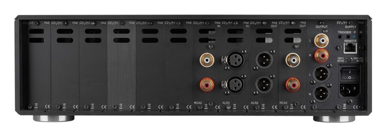 Auch hier wird der modulare Aufbau voll genutzt. Für die Ovation-Vorstufe gibt es eine nette Palette an aufpreispflichtigen Modulen, die Funktionalität und Umfang erweitern und eine flexible Anpassung an die Wünsche des Kunden ermöglichen. Das Basispaket bringt einen Satz analoge Eingänge in XLR- und RCA-Ausführung mit; wer mehr will, hat die freie Entscheidung. Analoghörer bestellen das Phono-Modul dazu, der typische EINSNULL-Leser mit all seinen digitalen Quellen erweitert die PA8 lieber um Digitaleingänge und eine USB-Buchse, die mit den passenden Treibern auch die hohe Bandbreite von 192 kHz schafft. Egal, welcher Audiofraktion man angehört, die PA8 ist so erweiterbar, dass alle bedient werden. Diese Flexibilität ist ein ganz großer Pluspunkt an der PA8, denn es ist völlig unerheblich, welche Komponenten Sie sich zukünftig leisten werden – sie kann sich anpassen. Das Erweitern des Systems ist auch recht flott geschehen, denn der handwerkliche Aufwand beschränkt sich auf das Lösen zweier Schrauben und das Einschieben einer Platine. Das kann man zur Not auch selbst machen, denn jedes Board passt nur in einen speziell dafür vorgesehenen Platz, eine fehlerhaft Montage ist ausgeschlossen. Direkt nach dem Start prüft das Betriebssystem, welche Komponenten verbaut sind und bietet in der Liste der auswählbaren Quellen immer nur die tatsächlich vorhandenen an. Außerdem lassen sich ungenutzte Kanäle abschalten, damit man nicht zu lange am Wahlschalter drehen muss, um die gewünschte Quelle auszuwählen. Für die bessere Übersicht über die angeschlossene Peripherie kann man außerdem die Namen der einzelnen Eingänge frei editieren. Die Symmetrierung der Signale und die eigentliche Pegelstellung erledigen Halbleiterexperten von Burr- Brown, großzügige Kupferbahnen auf den Leiterplatten mit viel „Rasen“ dazwischen transportieren ohne Übersprechen und nahezu verlustfrei zu den Baugruppen. Dem wertigen, exklusiven Eindruck zuträglich sind die beiden prominent präsentierten Drehknöpfe für Eingangswahl und Lautstärke. Die beiden silbern glänzenden Elemente drehen satt und sauber, selbst im ausgeschalteten Zustand habe ich ein paar Mal am Rädchen gespielt, weil‘s so schön war. Es zeigt sich also in jeder Ecke der Ovation-Komponenten: Die Entwicklung dieses Schmuckstücks wurde sehr akribisch vorgenommen, dafür sorgt schon Günther Mania, Schöpfer aller AVM-Komponenten. Jede noch so kleine Baugruppe wird auf klangliche Vorzüge untersucht und ausgewählt. All das gilt im selben Maße auch für den schweren Bruder, den ich der PA8 zur Seite gestellt habe.