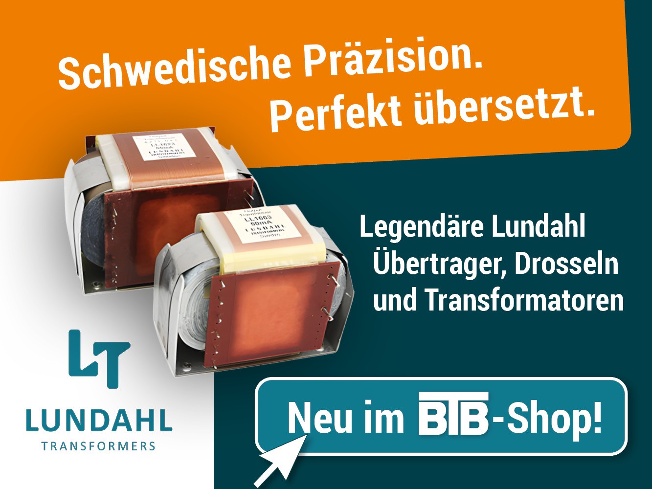 BTB Elektronik erweitert sein Portfolio um einen der renommiertesten Namen im Bereich audiophiler Übertragertechnik: Ab Februar sind Bauteile der schwedischen Traditionsmarke Lundahl Transformers über den BTB-Shop erhältlich. Damit wird BTB offizieller Distributor für Lundahl Übertrager, Drosseln und Transformatoren in Europa und beliefert sowohl Endkunden als auch den Fachhandel – von Einzelstücken bis hin zur Serienfertigung.