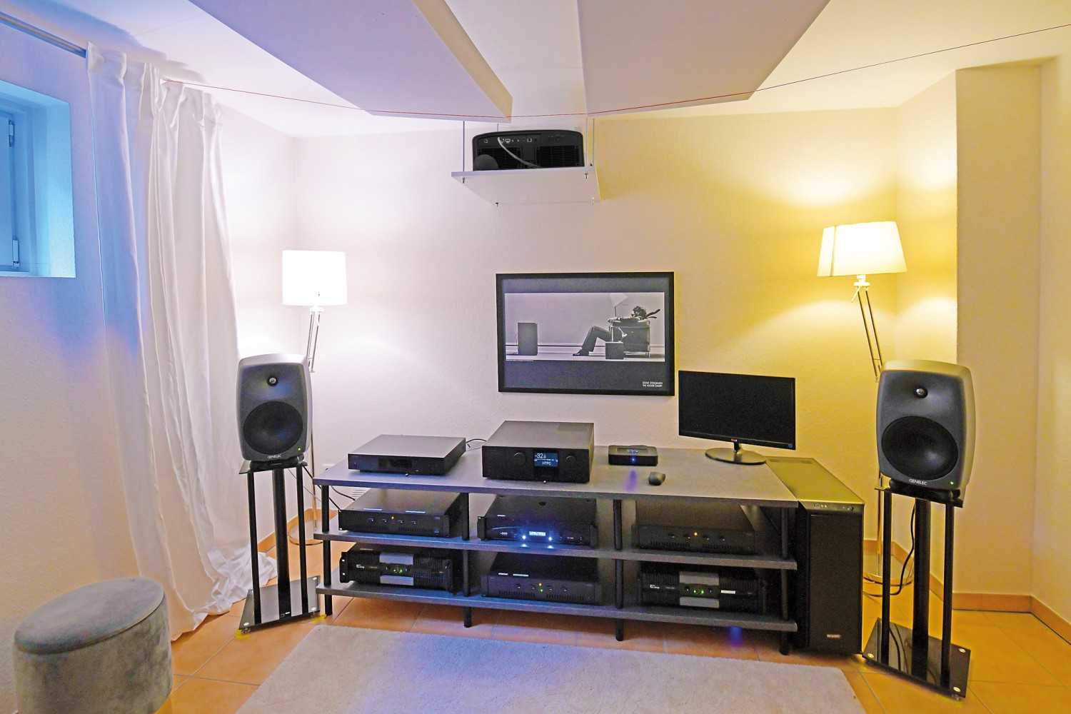 Bevor es in den Kinosaal geht, führt mich Ralph in den Vorführraum. Dieser befindet sich direkt hinter dem Kino. Hierbei handelt es sich um ein überaus geräumiges und gemütlich eingerichtetes Zimmer mit bequemer Couch, das auch als Gästezimmer fungiert. Hier ist die komplette Technik für das Kino untergebracht: Player, Vorstufe, Endstufen, Mini DSP. Echte Studiomonitore von Genelec (BPM 8050) sorgen für natürlichen Stereo-Sound. Ein Wanddurchbruch via Kernbohrung ermöglicht es dem JVC DLANZ7, ein natives 4K-Bild auf die große Cinemascope-Leinwand im Kinosaal zu zaubern. Ein paar Absorber unter der Decke zeugen vom hohen musikalischen Anspruch meines Gastgebers.
