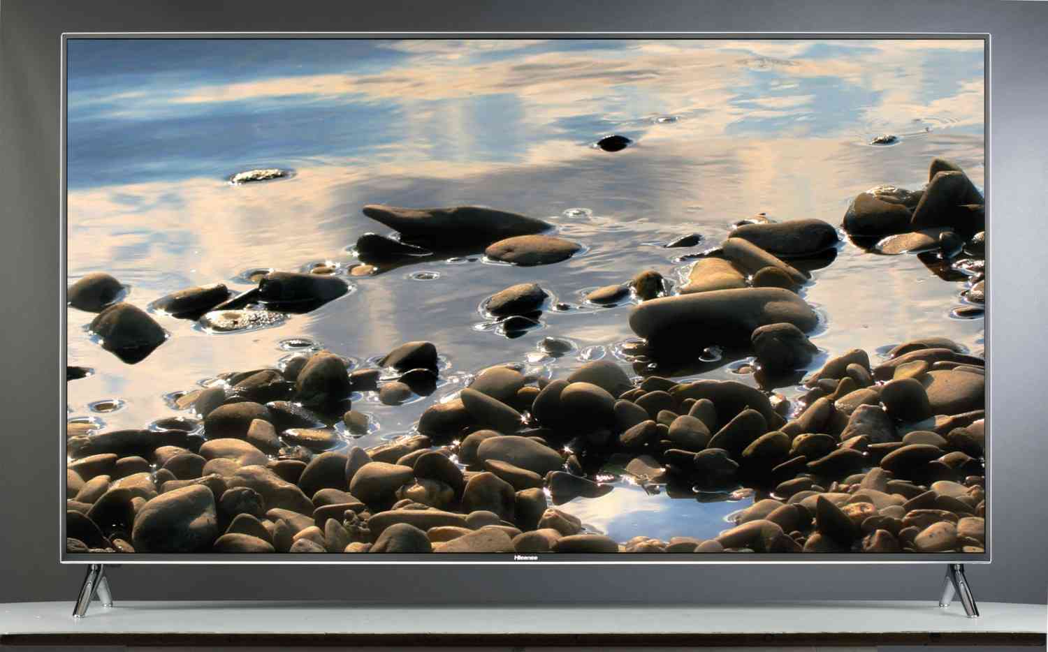 Die 164 cm Bilddiagonale des Hisense-Fernsehers werden von einem schicken, gebürsteten Metallrahmen umfasst. Trotz seines stattlichen Gesamtgewichts ist die Bauform insgesamt schlank gehalten, so dass der UHD-TV auch an der Wand aufgehängt eine gute Figur macht.