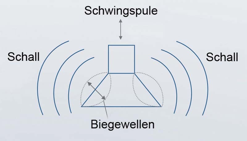 Beim DDD-Wandler bewegt sich die Membran nicht hin und her, sondern sie wird bewusst zu Verformungsschwingungen angeregt. Diese beim konventionellen Lautsprecher meist unerwünschten Verformungen gehören beim DDD-Wandler zum Funktionsprinzip. Vom Mitteltonbereich aufwärts breiten sich Biegewellen in der Membran aus und regen die Luft zu Schallwellen an. Das geschieht kontinuierlich und natürlich entsprechend der Anregungsfrequenz (also entsprechend des Musiksignals). Wir hören also Musik. Doch wozu der ganze Aufwand? Der erste große Vorteil ist, dass der Biegewellenwandler praktisch alle Musikfrequenzen oberhalb seiner Einsatzfrequenz von ca. 200 Hz gleichermaßen gut verarbeiten kann. Er ist also Grundtöner, Mitteltöner und Hochtöner in einem. Das ermöglicht eine phasenrichtige Wiedergabe, da keine Frequenzweichen ihr Unwesen treiben. Der zweite Vorteil ist das Abstrahlverhalten des DDD-Wandlers. Aus dem Bauch heraus traut man ihm ein horizontales Rundumstrahlen zu, immerhin ist er zylindersymmetrisch aufgebaut. Doch in Wirklichkeit ist der Wandler in der Lage, kugelförmig abzustrahlen! Der Abstrahlwinkel wird nämlich durch die Ausbreitungsgeschwindigkeit der Biegewellen in der Membran beeinflusst und die lässt sich konstruktiv steuern. Dazu variieren die Ingenieure bei German Physiks u.a. die Materialstärke der Membran, die um 0,15 mm beträgt. Jahrelange Entwicklungsarbeit und jede Menge Know-how stecken in diesem Schallwandler. In der Limited 11 wird übrigens kein abgespeckter DDD-Wandler verbaut, sondern der gleiche wie in den mehrfach teureren Lautsprechern von German Physiks – da wird schon plausibel, dass German Physiks von einem besonders preiswertem Modell spricht.