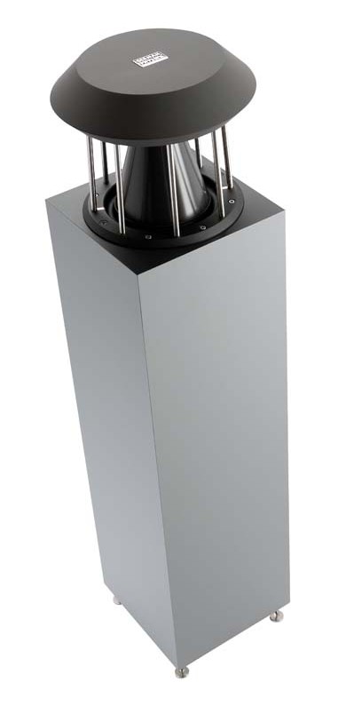 Wie eingangs erwähnt, handelt es sich bei Lautsprechern von German Physiks um etwas ganz Besonderes. Sie werden nicht nur komplett in Deutschland entwickelt und in aufwendiger Handarbeit gefertigt, sie sind auch technologisch vollkommen eigenständig und einfach anders als alle anderen. Das zentrale Element und Markenzeichen aller German-Physiks-Lautsprecher ist optisch wie technisch der einzigartige DDD-Wandler, der oben auf der Box thront. Der sieht nicht nur anders aus als ein konventioneller Lautsprecher, er ist es auch. DDD steht für Dicks Dipole Driver und auf eben diesen Herr Dicks gehen sowohl der Prototyp des Wandlers als auch die Theorie zu seinem Funktionsprinzip zurück. Das war Anfang der Achtziger und gab die Initialzündung für alle German-Physiks-Lautsprecher ab. Doch was ist so besonders am DDD-Wandler? Er ähnelt einem Konuslautsprecher, den man mit dem „Gesicht“ nach unten auf die Box montiert hat. Oben sitzt ein Antrieb mit Schwingspule, und wo andere Lautsprecher einen Korb aus Stahlblech oder Aluminium haben, verfügt der DDD-Wandler über ein Gerüst aus schlanken Edelstahlstangen. Das erscheint plausibel, denn der DDD-Wandler strahlt offensichtlich den Schall rundum in den Raum. Seine superleichte Membran besteht aus Carbonfaser und ist konusförmig, dabei aber deutlich länglicher als die Membranen der Lautsprecher, die man so kennt. Jetzt ist es Zeit, die Katze aus dem Sack zu lassen: Wir haben einen Biegewellenwandler vor uns, der sich nur bei tiefen Frequenzen in etwa wie ein konventioneller Lautsprecher bewegt.