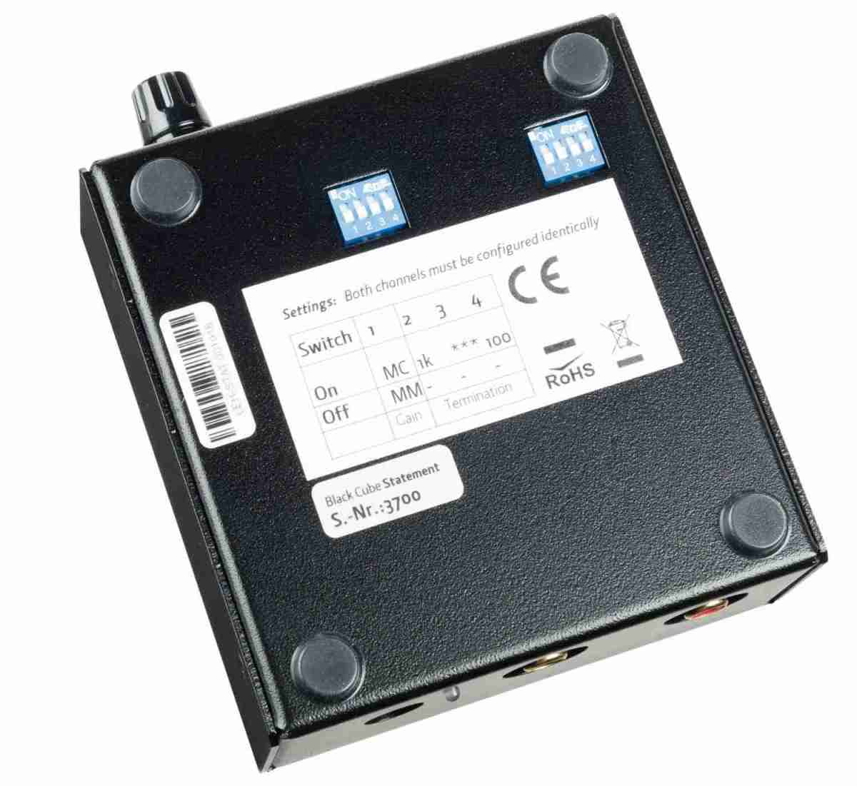 Der optimale Klang von MC-Systemen ist neben der richtigen Verstärkung auch vom Anschlusswiderstand des Systems an den Phonovorverstärker abhängig. Hochwertige Phonovorverstärker bieten deshalb die Möglichkeit, den Anschlusswiderstand an das jeweilige MC-System anzupassen. Auch der Black Cube Statement bietet diese Möglichkeit. Mithilfe der Mikroschalter auf der Unterseite lässt sich der Anschlusswiderstand an Systeme mit niedriger und mit hoher Impedanz anpassen. Hier stehen Werte von 100 und 1000 Ohm zur Verfügung. Über einen dritten Schalter lässt sich auch ein beliebiger Widerstand einschalten, der im Inneren des Geräts eingesteckt werden kann. Das ist vielleicht ein wenig kompliziert, dafür bietet der Black Cube Statement eine so flexible Anpassungsmöglichkeit, wie man sie selbst bei viel teureren Geräten oft vergeblich sucht.