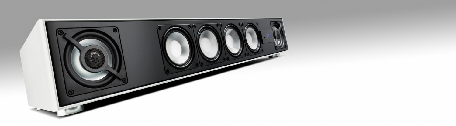 Das sehr robuste Gehäuse aus HDF ist in mattem Schwarz und Weiß sowie hochglänzendem Schwarz erhältlich. Erstmals stellt Canton bei einem Soundbar HDMI-Ein- und Ausgänge auf dem Aktivmodul zur Verfügung. Drei Quellgeräte finden hier Kontakt, sogar mit 3D und 4K versteht sich der Soundbar DM 90.3 von Canton. Der HDMI-Output ist ARC-fähig, kann also direkt mit dem Audio-Rear-Channel des Fernsehers kommunizieren, was es möglich macht, die Lautstärke des DM 90.3 mit der TV-Fernbedienung zu regeln. Zweimal 50 Watt für die beiden 100-mm-Koaxialchassis an den äußeren Enden der Front und nochmals die gleiche Leistung für die vier 100-mm-Subwoofer- treiber stellt das Aktivmodul zur Verfügung. Wie bei Canton üblich, bestehen die Membranen der eingesetzten Chassis aus leichtem, aber überaus steifem Aluminium. Die langhubigen Tieftöner arbeiten auf ein gemeinsames, rückseitig ventiliertes, Bassreflexgehäuse bis zur Übernahmefrequenz bei 150 Hertz. Darüber spielen die Koaxtreiber, deren Mitteltöner die gleiche Größe wie die Subwoofer aufweisen und somit über ordentliche Dynamikreserven verfügen. Im Zentrum des Chassis sitzt, auf einem Steg befestigt, eine hochbelastbare 25-mm-Hochtonkalotte. Damit den vier Subwoofern bei hohen Lautstärken nicht die Puste ausgeht, werden diese mit einem steilflankigen Hochpassfilter unterhalb von rund 40 Hertz aus dem Rennen genommen. Ebenfalls neu im Canton DM 90.3 ist der fortgeschrittene DTS- TruSurround-HD-Algorithmus, der noch überzeugendere Surround- klangefffekte im Vergleich zum bisher eingesetzten SRS-TruSurround HD erzeugen kann. Cantons Technik basiert auf dem Prinzip der Head-Related Transfer Function (Deutsch: Außenohrübertragungs- funktion) das die komplexe Filterwirkung von Kopf, Außenohr und Rumpf beschreibt. Auf das RDS-Tunermodul des Vorgängers verzichtet Canton neuerdings, dafür spendieren sie dem Soundbar eine Bluetooth-3.0-Schnittstelle mit AptX-Dekodierung. Die komplette Signalverarbeitung übernimmt der 24-bit-Einzelchip-Audioprozessor D2Audio DAE-6. Dank effektiver Schaltverstärker ist die Leistungsaufnahme im Betrieb recht gering, im Standby sind es nur noch 0,4 Watt.